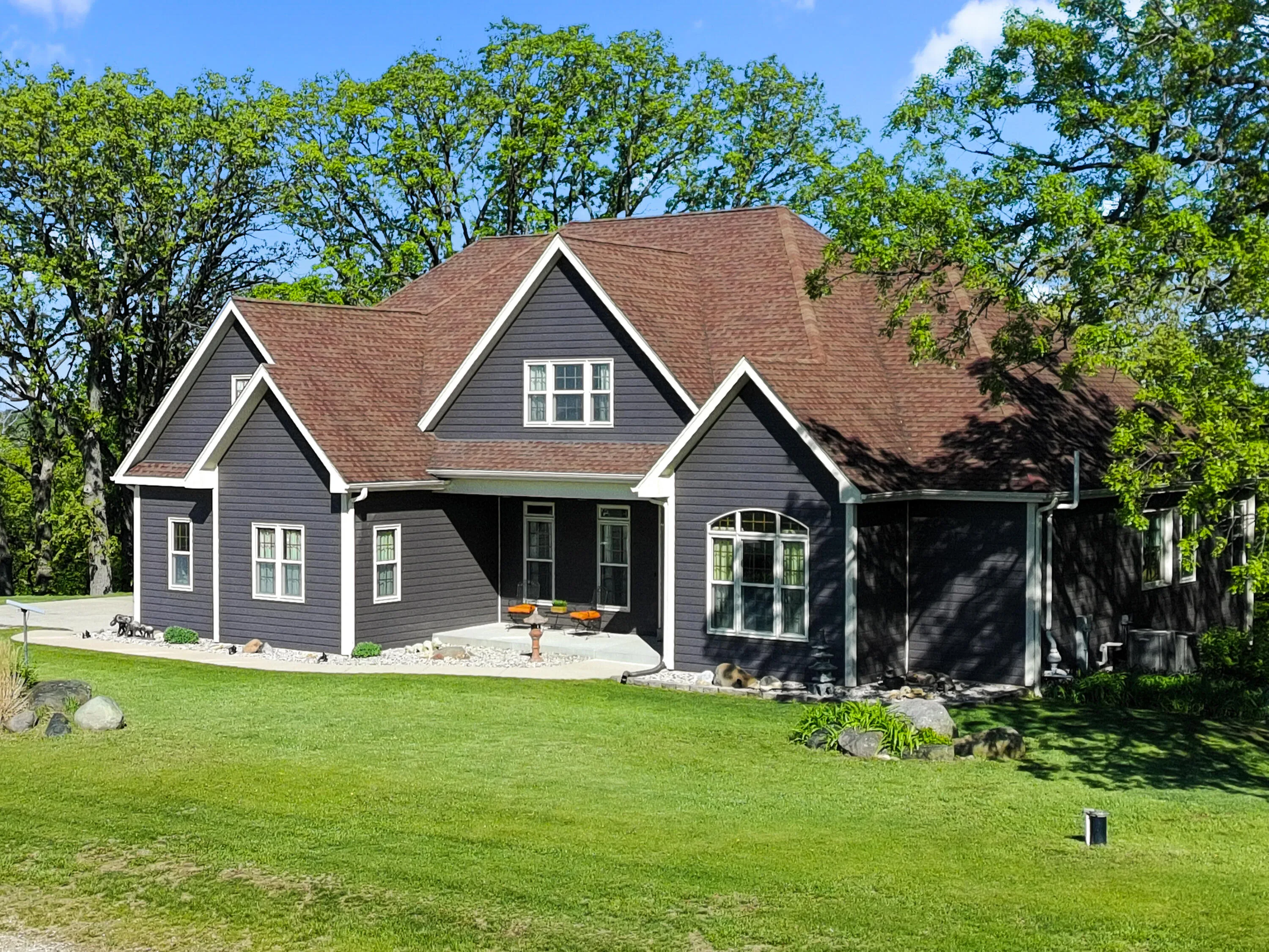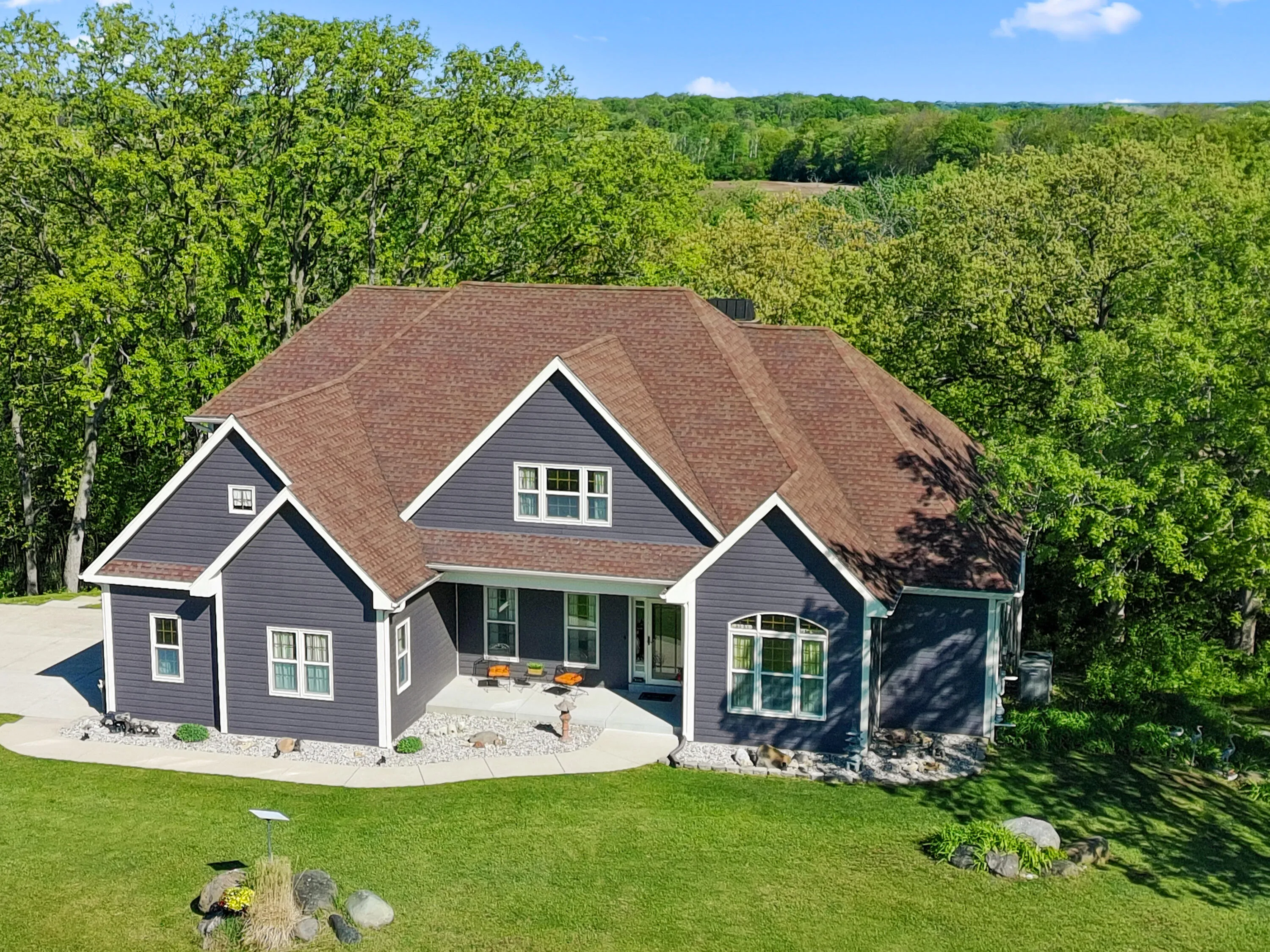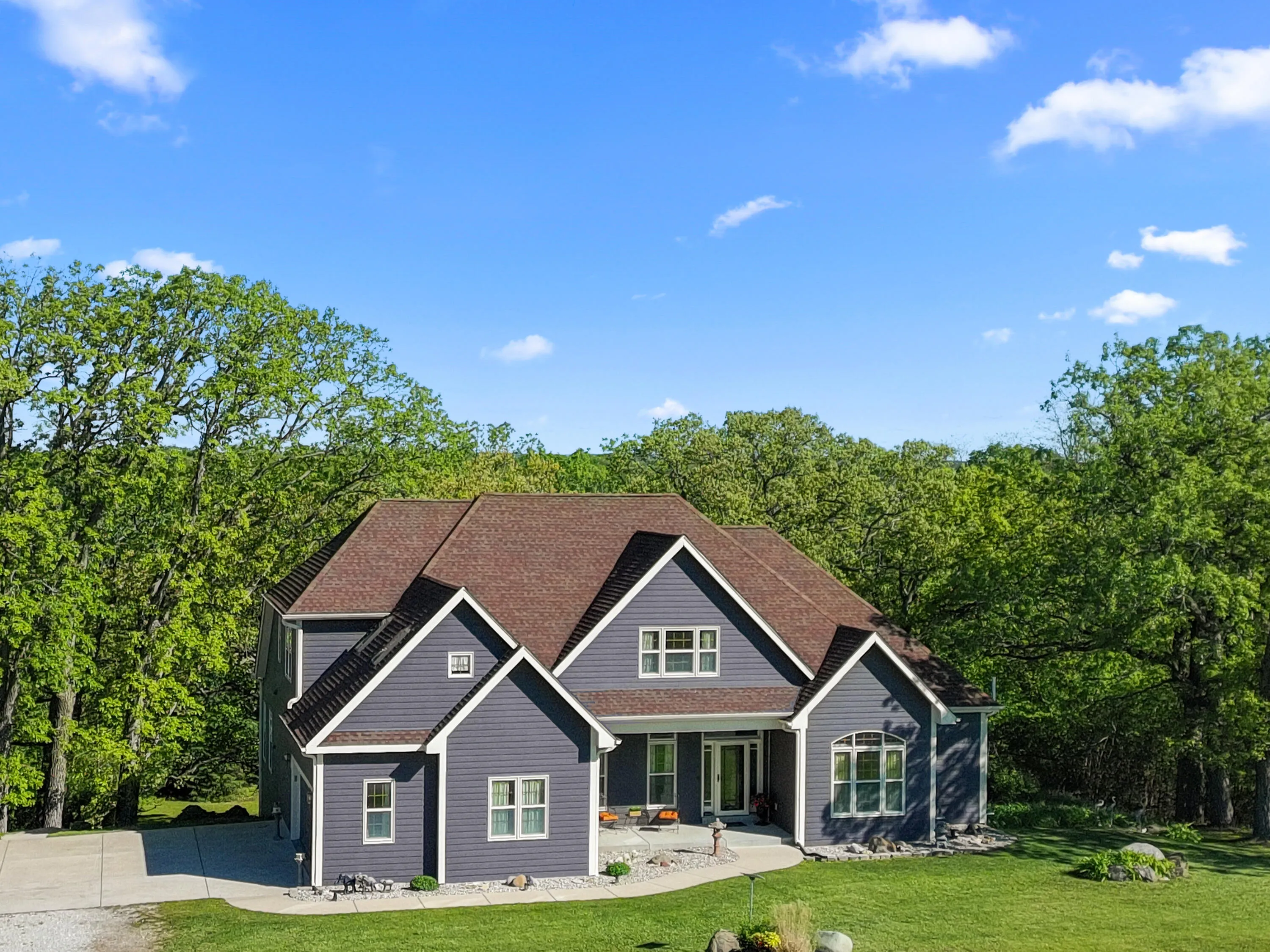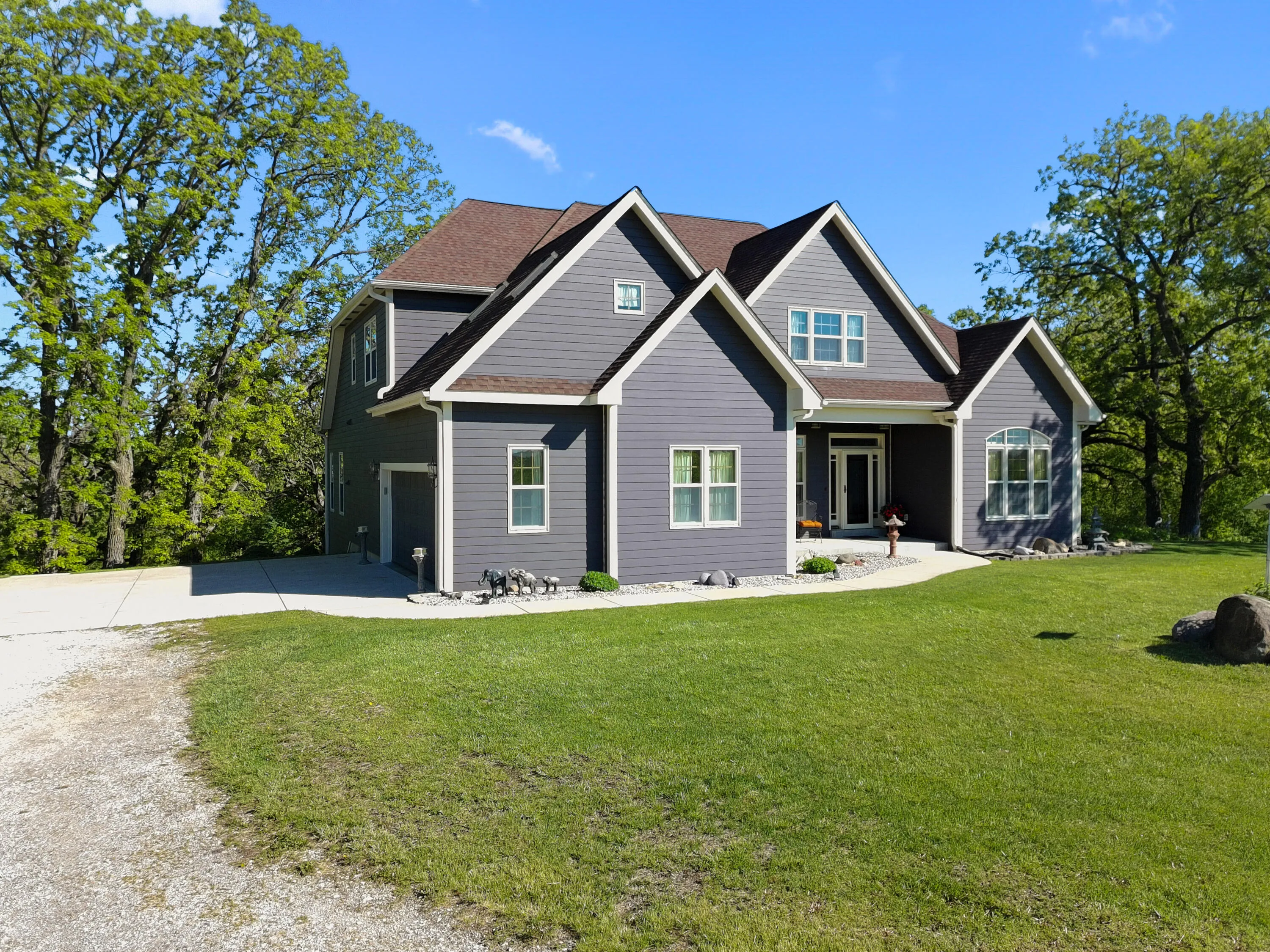 BACK ON THE MARKET through no fault of the Seller! Conveniently located only 2.5 miles from I-43, ideal for daily travel. Prime commuter location. The ultimate nature enthusiast property on a very private 5.73 acres, amongst majestic oak trees. You’ll be impressed by this 5BD, 3.5BA, 2 story with finished walk-out. As you enter the foyer off the covered porch you’re greeted by the LR with vaulted ceiling gas fireplace adjacent to Ktch w/ wood floors, large breakfast bar, granite tops & new Bosch appliances WiFi capable. Master BD ensuite with double vanity, soaking tub plus glass shower & walk-in closet. Upstairs offers a loft 3rd BD with sitting area, jack and jill bath & 4th Bd. Family room walk-out to patio, 5th Bd and ample storage. Walking trails throughout & natural spring pond