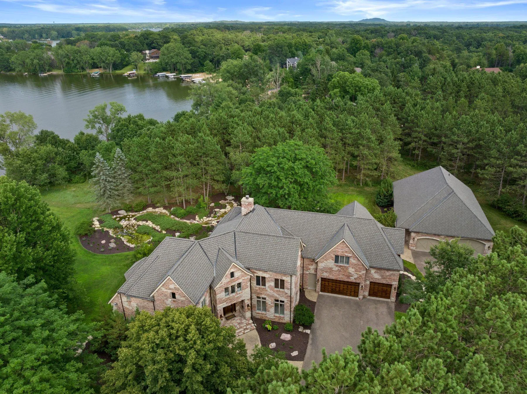 This extraordinary estate is designed for both a luxury summer getaway and a year-round lifestyle. Nestled within 5 acres of serene landscape & with over 300′ of Lake Arrowhead frontage, this home offers the utmost privacy, ensuring both security & peace of mind. Spread over 8,000 sq ft, the home features a gourmet kitchen, 3 fireplaces, 5 bedrooms, 5 full baths & 4 half baths, including a 1-bedroom guest/au pair suite. Additional amenities include a theater room, hot tub, sauna room, radiant in-floor heating & 2 laundry rooms. A peaceful pond w/ waterfall, inviting patio, carriage house & 6 parking spaces complete the amazing grounds. Unwind at the fully equipped country club inspired ”19th Hole” pub on the LL or explore the nearby resort club amenities including premier golf courses.