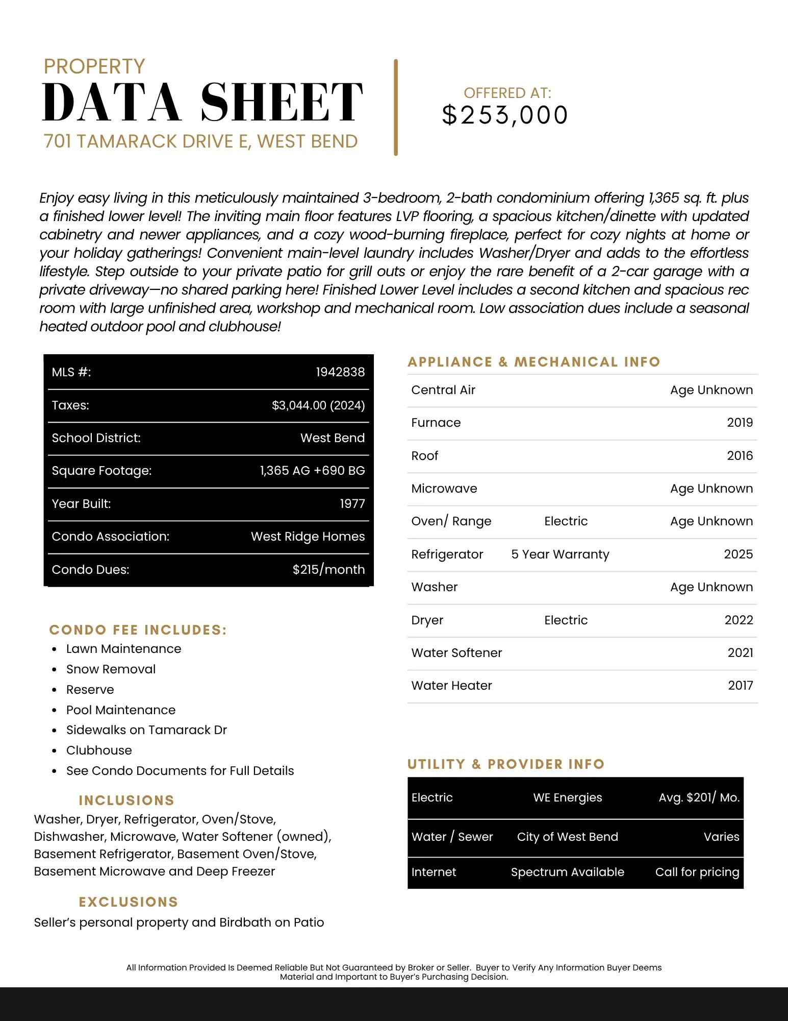$253,000. Enjoy easy living in this meticulously maintained 3-bedroom, 2-bath condominium offering 1,365 sq. ft. plus a finished lower level! The inviting main floor features LVP flooring, a spacious kitchen/dinette with updated cabinetry and newer appliances, and a cozy wood-burning fireplace, perfect for cozy nights at home or your holiday gatherings! Convenient main-level laundry includes Washer/Dryer and adds to the effortless lifestyle. Step outside to your private patio for grill outs or enjoy the rare benefit of a 2-car garage with a private drivewayano shared parking here! Finished LL with 2nd Kitchen and loads of unfinished storage area. Low association dues include a seasonal heated outdoor pool and clubhouse! See features sheet for numerous updates!