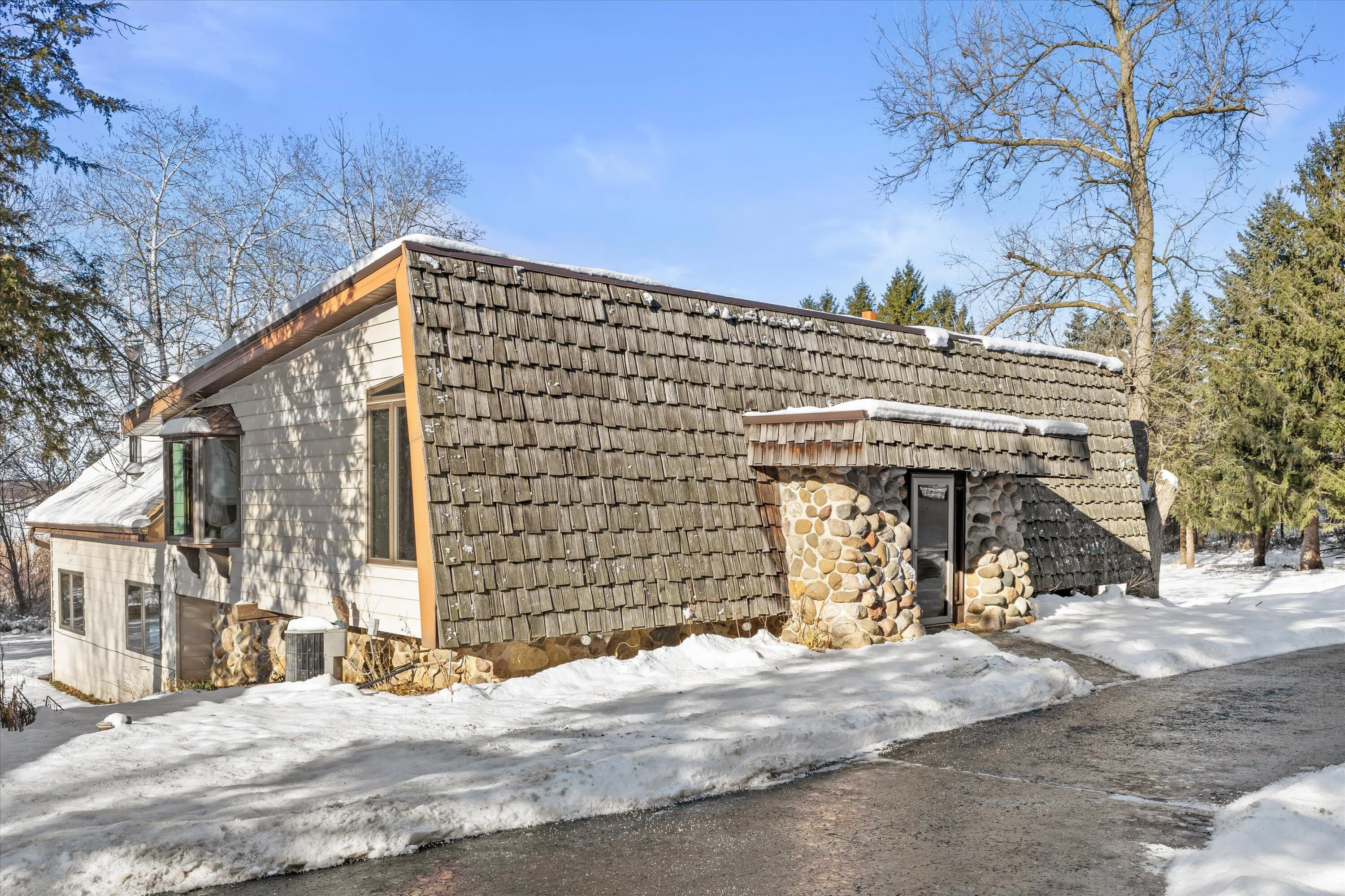 Beautifully set on 2+ acres, this unique 3-bedroom home offers exceptional potential and striking architectural charm. Enjoy a convenient main-level primary bedroom, nicely updated bathrooms, and a well-designed kitchen. The spacious great room features soaring ceilings and stunning views, creating an inviting space for everyday living and entertaining. Bright, open areas provide endless possibilities to personalize and update to your style. With its serene setting, expansive yard, and standout design, this property is a rare opportunity to create your dream retreat.