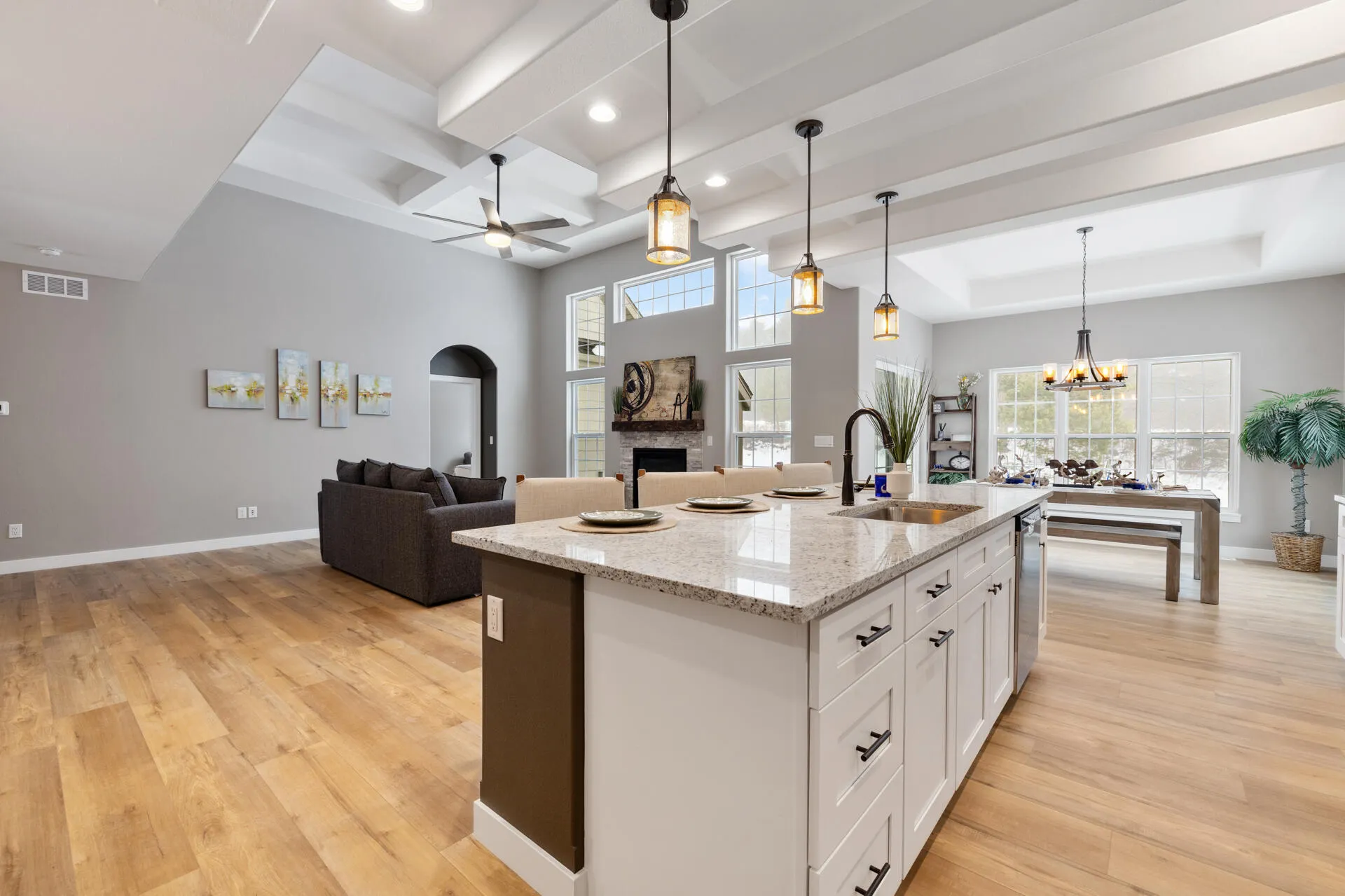 Discover refined living in this new construction, spacious 2-BR, 2-BA condo designed for everyday comfort and entertaining. Soaring 9′ ceilings and an open-concept layout create a warm, inviting atmosphere anchored by a cozy gas fireplace. The chef’s kitchen shines with a large island, quartz counters, oversized walk-in pantry, and dry bar with 2 beverage coolers. The primary suite offers a private retreat with a custom tiled walk-in shower and an exceptional his-and-hers walk-in closet with direct laundry access. Full basement with 9′ ceilings, 4 windows, & plumbed for a 3rd BAready for future expansion. 2.5 car attached garage. 35 minutes from Milwaukee. Est. completion in Oct 2026. Photos of different unit with upgrades.