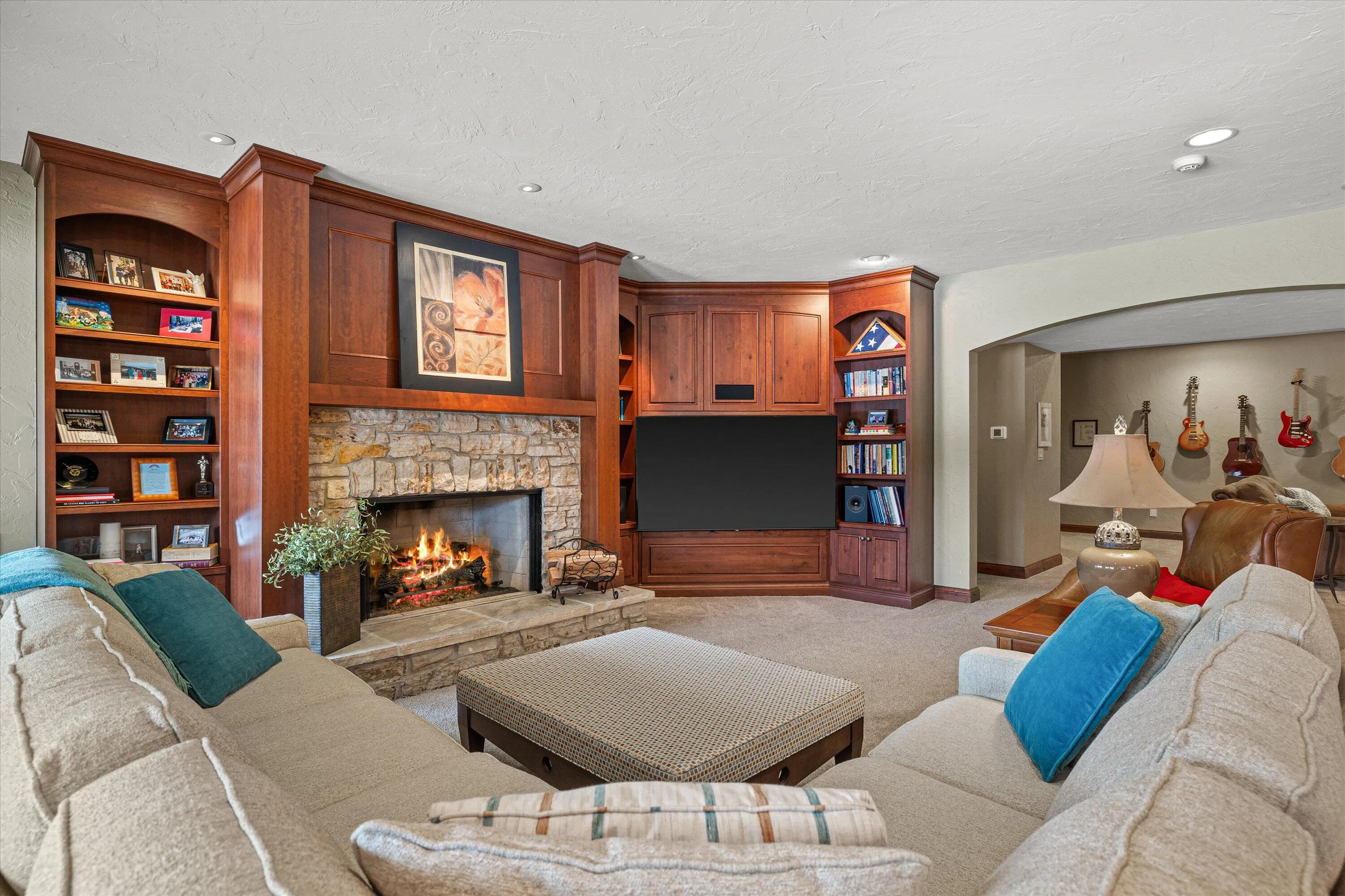 Lakeside Development Premiere Custom Built Home in sought after Stonefields Subdivision. Exceptional craftsmanship throughout features six inch base molding, double crown, soaring beamed ceilings in great room, three fireplaces, and stunning sight lines throughout. Kitchen is open to great room and features, custom inset cabinetry, state of the art appliances, gleaming counters and back splash, chef’s island, and exceptional custom butler’s pantry. Spa like first floor primary with walk-in closets soaring ceilings, dual sinks, walk-in shower, soaking tub, and fireplace. 3 ensuite bedrooms up are spacious. Lower Level walkout with gorgeous views of private backyard has beautiful patio, 3rd fireplace, wine cellar, kitchen, 1/2 bath, and workout area. All brick exterior and 3.5 Car Garage.