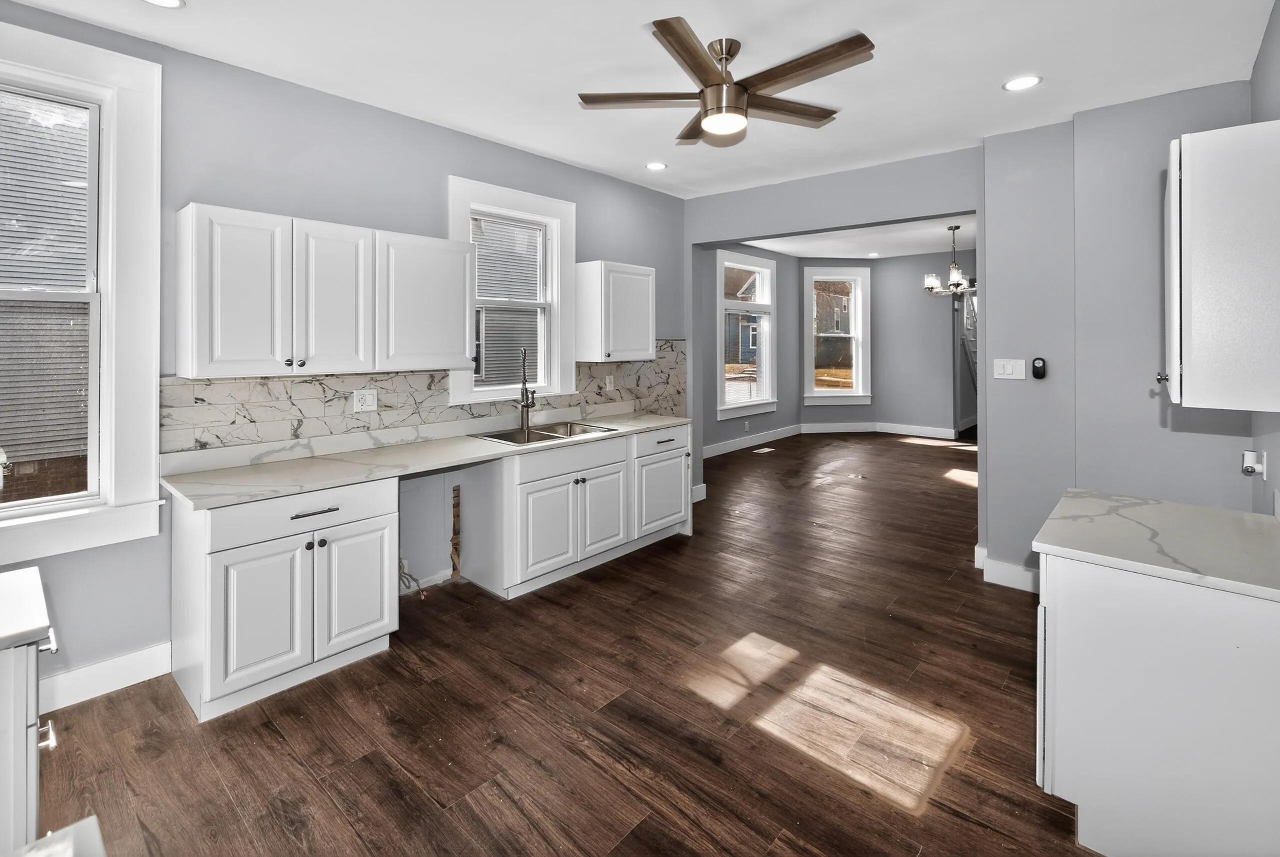WOW! Extensively renovated 3-story Victorian offering 5 bedrooms and incredible updates throughout, including newer siding, roof, windows, kitchen, baths, flooring, and a stunning finished attic addition. The bright kitchen features quartz countertops and backsplash, LVP flooring, and recessed lighting. Spacious living room with large picture window and formal dining room perfect for entertaining. Main-level laundry, two bedrooms, and a full bath with tiled shower/tub combo and glass block window. Upstairs boasts a private primary suite plus another en-suite bedroom. Finished attic adds a 5th bedroom, huge walk-in closet, and half bath. Rear parking for 3 cars.