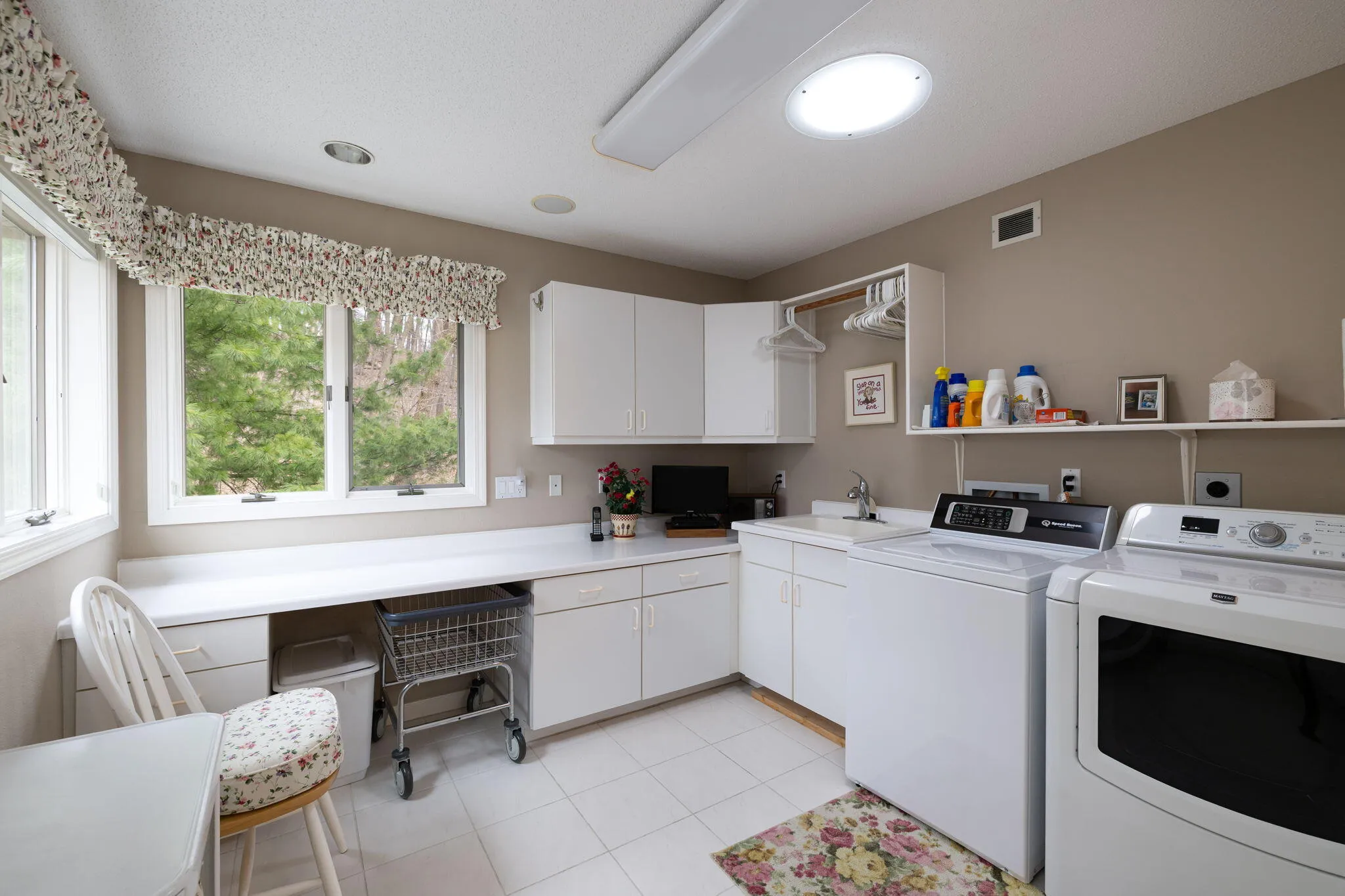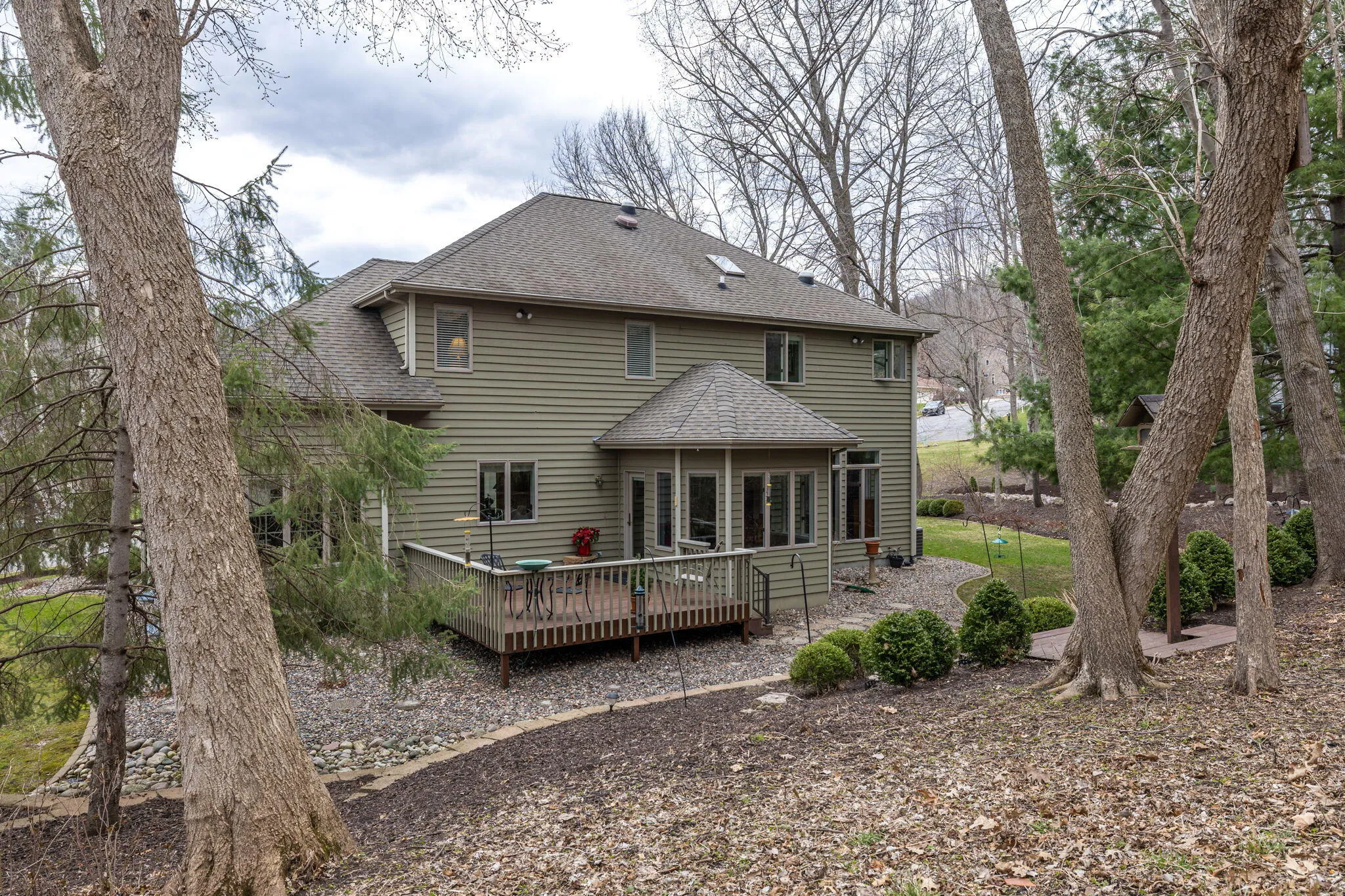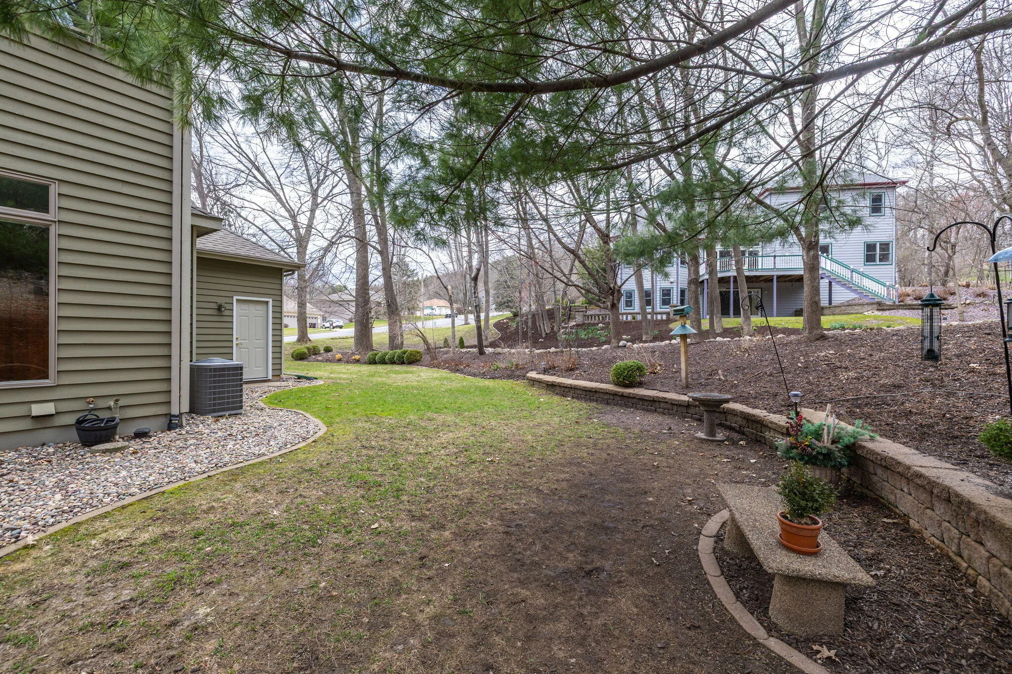Set on a wooded .67 acre lot in Elmwood Hills, this home reflects years of thoughtful care and attention. The setting is a standout; with professional landscaping, mature trees, and private outdoor spaces- often with visits from wildlife. Quality construction and a functional layout define the home, with Andersen windows bringing in natural light and a built-in sound system carried throughout. The spacious kitchen includes a pantry and breakfast nook overlooking the yard, opening to a family room with a gas fireplace and wet bar. All bedrooms are up with a large laundry room nearby. The lower adds additional living space and a full bath. The garage is finished and heated, with stairs connecting to the basement. Located near a park and within the Eagle Bluff Elementary district.
