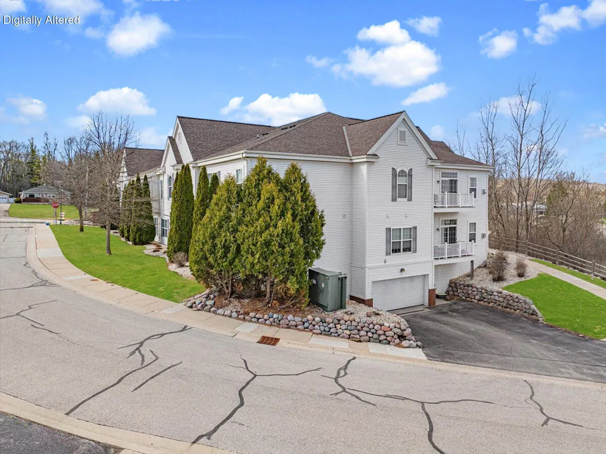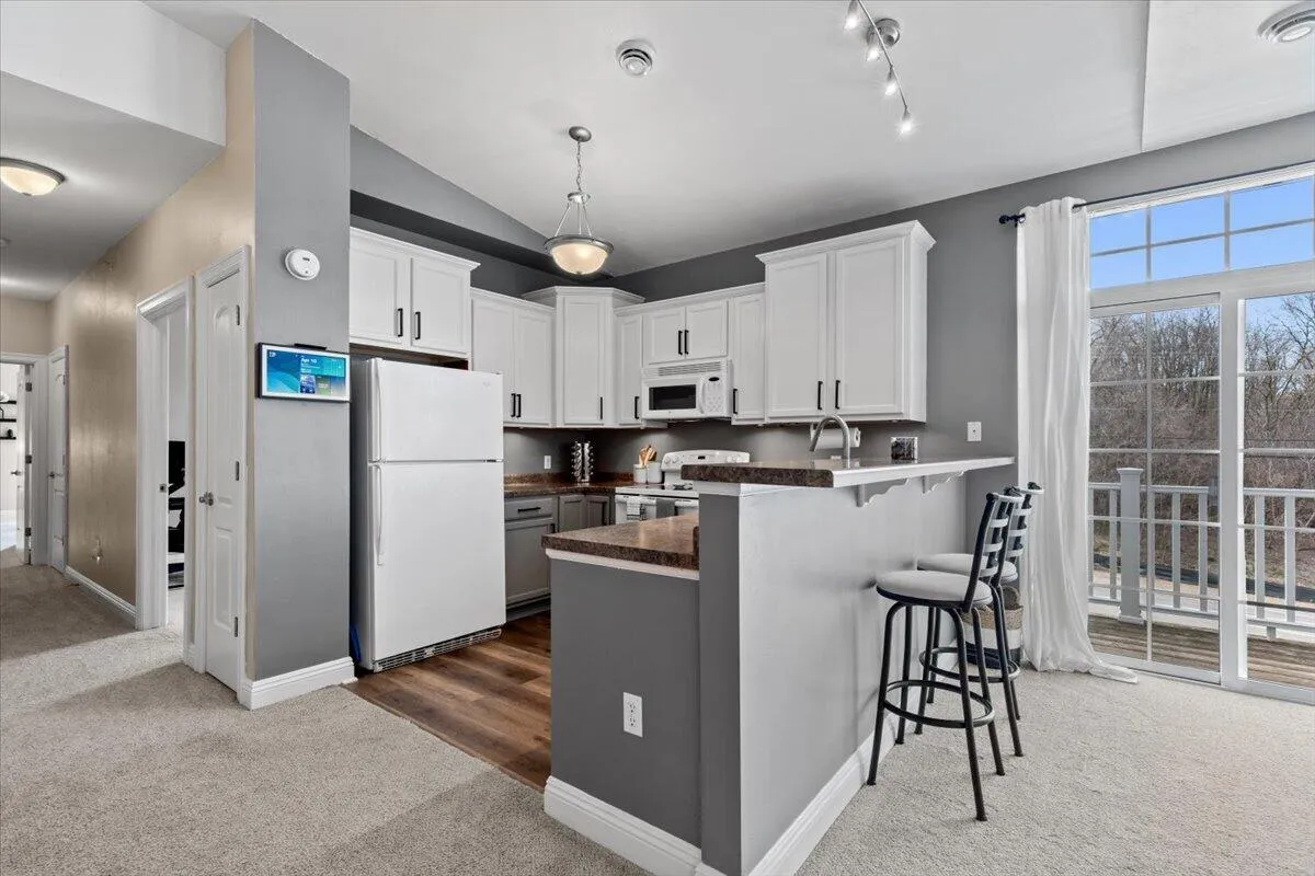 Inviting 2BR, 2BA 2nd-floor end-unit condo offering 1,226 sq ft filled with natural light. Open-concept floor plan connects living room,dining area & kitchen. Vaulted ceilings enhance airy feel; Living room features brick GFP & patio doors to private balcony. Kitchen offers breakfast bar,abundant cabinet/counter space & new flooring. Primary suite includes walk-in closet & private ensuite bath w/walk-in shower.New flooring in both BA’s,ample storage throughout & in-unit laundry.Includes 2 designated underground heated garage parking spaces + private storage area.Pet-friendly assoc. at edge of Lac Lawrann Conservancy near trails & Rainbow Lake,surrounded by peaceful nature,yet close to freeway,shopping,dining & schools. Condo dues include lawn care,snow removal,water & sewer.Move-in ready!