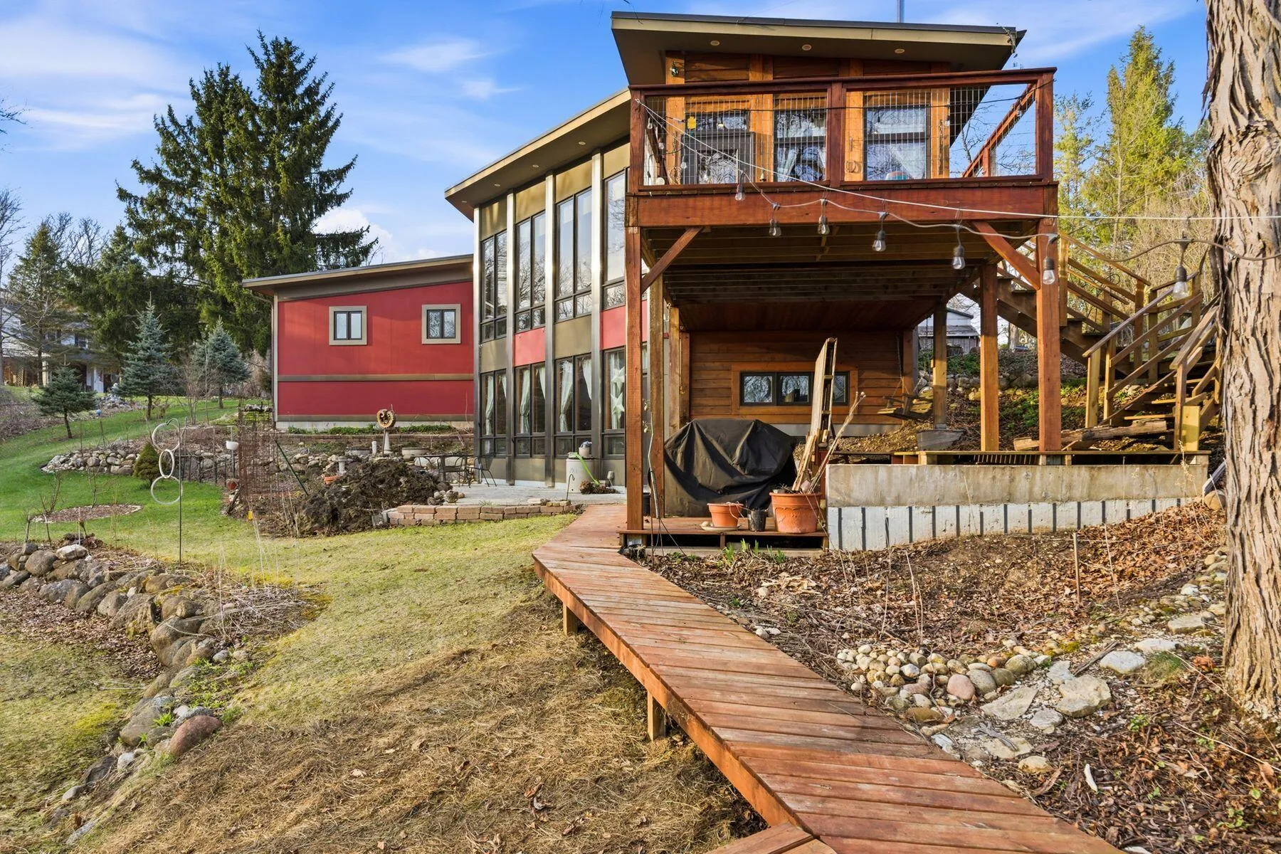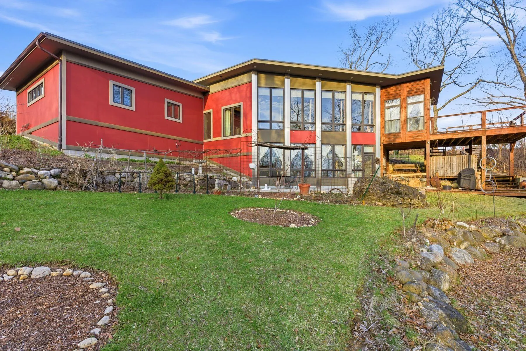 Set on a wooded lot with butterfly gardens, Mid-Century Modern meets rustic charm in this architecturally notable retreat. Built in 2012 and reimagined in 2016, this ACI-honored concrete structure features 10′ ceilings & walls of windows overlooking a serene, private backdrop. The main level boasts oak hardwoods, maple millwork, and a remodeled kitchen. French doors lead to a sunroom and an expansive deck, perfect for spotting bald eagles & deer. The primary ensuite features subway & glass tile, while the finished walk-out LL adds a 2nd bedroom, full bath & living area. Also included, ShelterLogic portable shed, detached studio/workshop, and 4-car garage, 2 garages w/220V power. Complete w/ an underground cistern & Iron Curtain, this home is a true nature lover’s dream. Virtually enhanced.