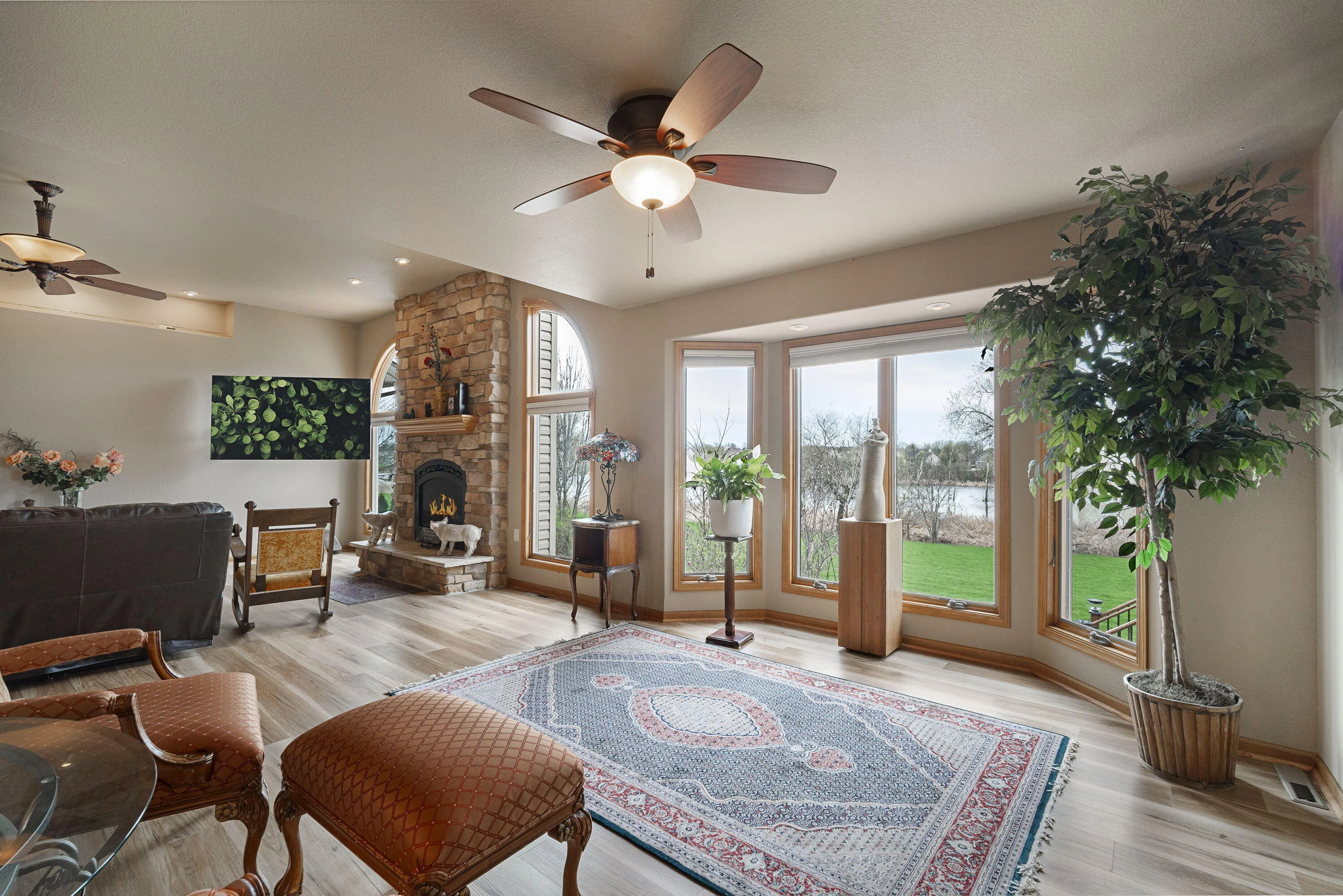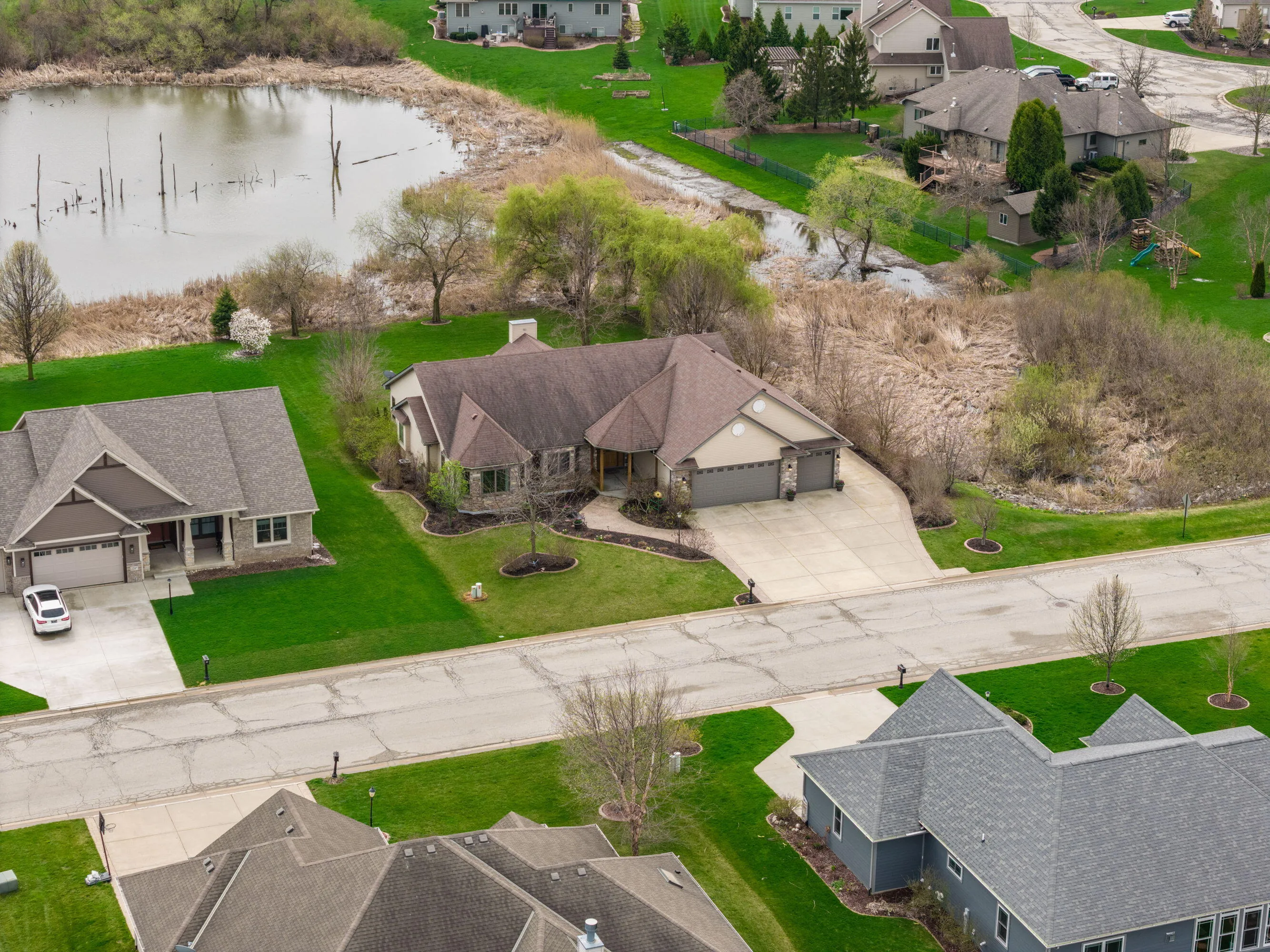 Custom-built ranch in Jamestown with 100′ of pond frontage and no neighbor to the east–talk about privacy! A beautiful foyer opens to the living room featuring a fireplace and oversized windows. Open kitchen with stainless steel appliances, breakfast bar and great flow for entertaining. Sunroom with walk out access to the expansive deck and patio overlooking the pond. Primary suite with whirlpool tub, separate shower, skylight and spacious walk-in closet. Partially finished lower level for entertaining, featuring a custom bar area, half bath, 9′ ceilings, full size windows, and versatile bonus rooms ideal for a home office, gym, or guest space. 900sqft garage with 4th car potential, expansive walk-up attic, dual laundry rooms, plus a huge parking pad for camper, boat, or extra vehicles!