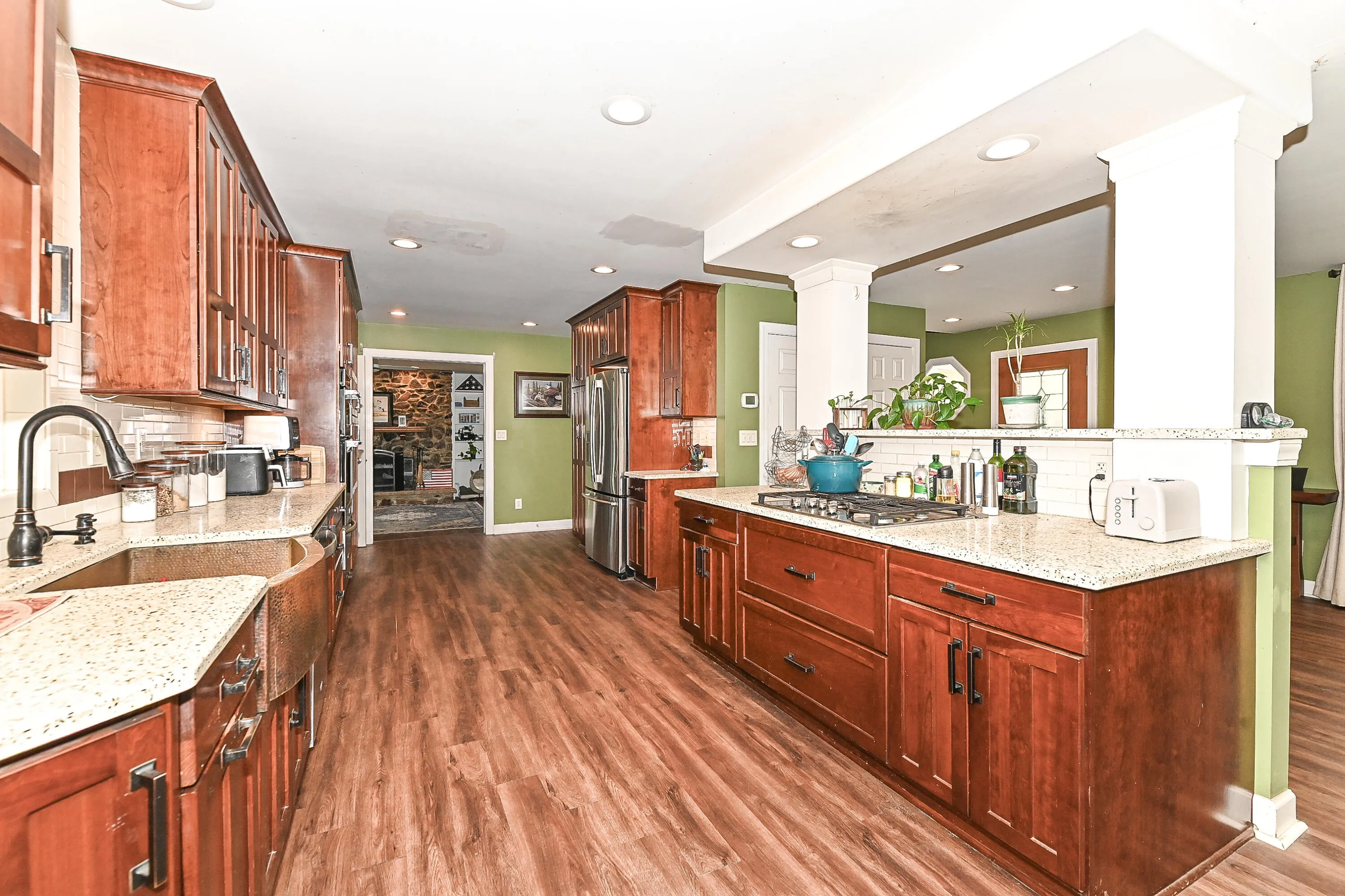 Beautiful Bristol Colonial! Start your day on the inviting east-facing front porch and unwind in the expansive west-facing screened room or deck–perfect for sunset views. Nicely updated kitchen features solid surface counters, newer cabinetry, and stainless steel appliances, opening to a bright family room with skylights, a cozy wood-burning fireplace, and access to the deck and fenced yard. Upstairs is an expansive primary suite with vaulted ceilings, a custom bookshelf, ensuite bath, and a large walk-in closet with built-ins. Generous secondary bedrooms provide flexibility and comfort. A beautiful blend of warmth, space, and everyday living!