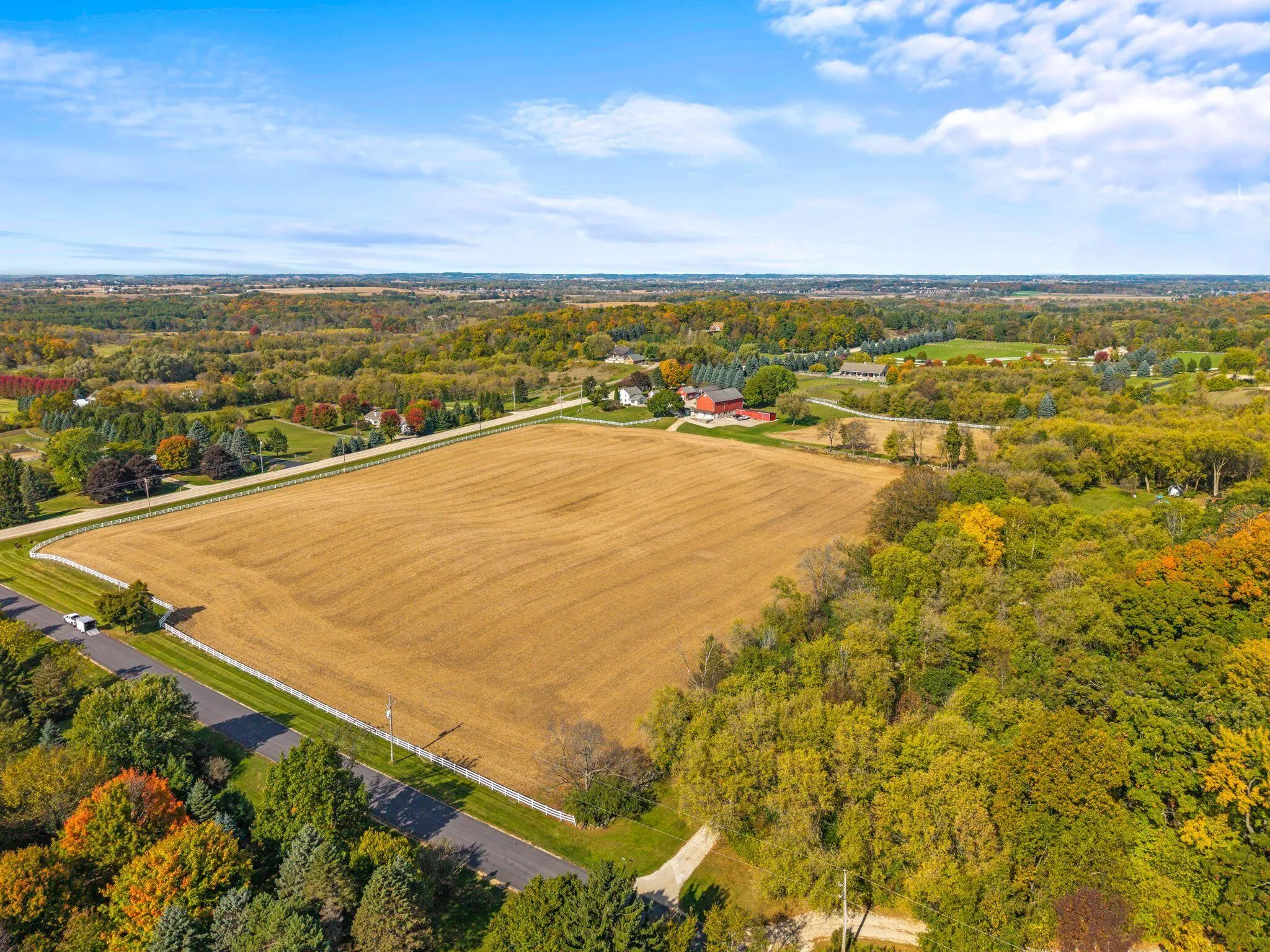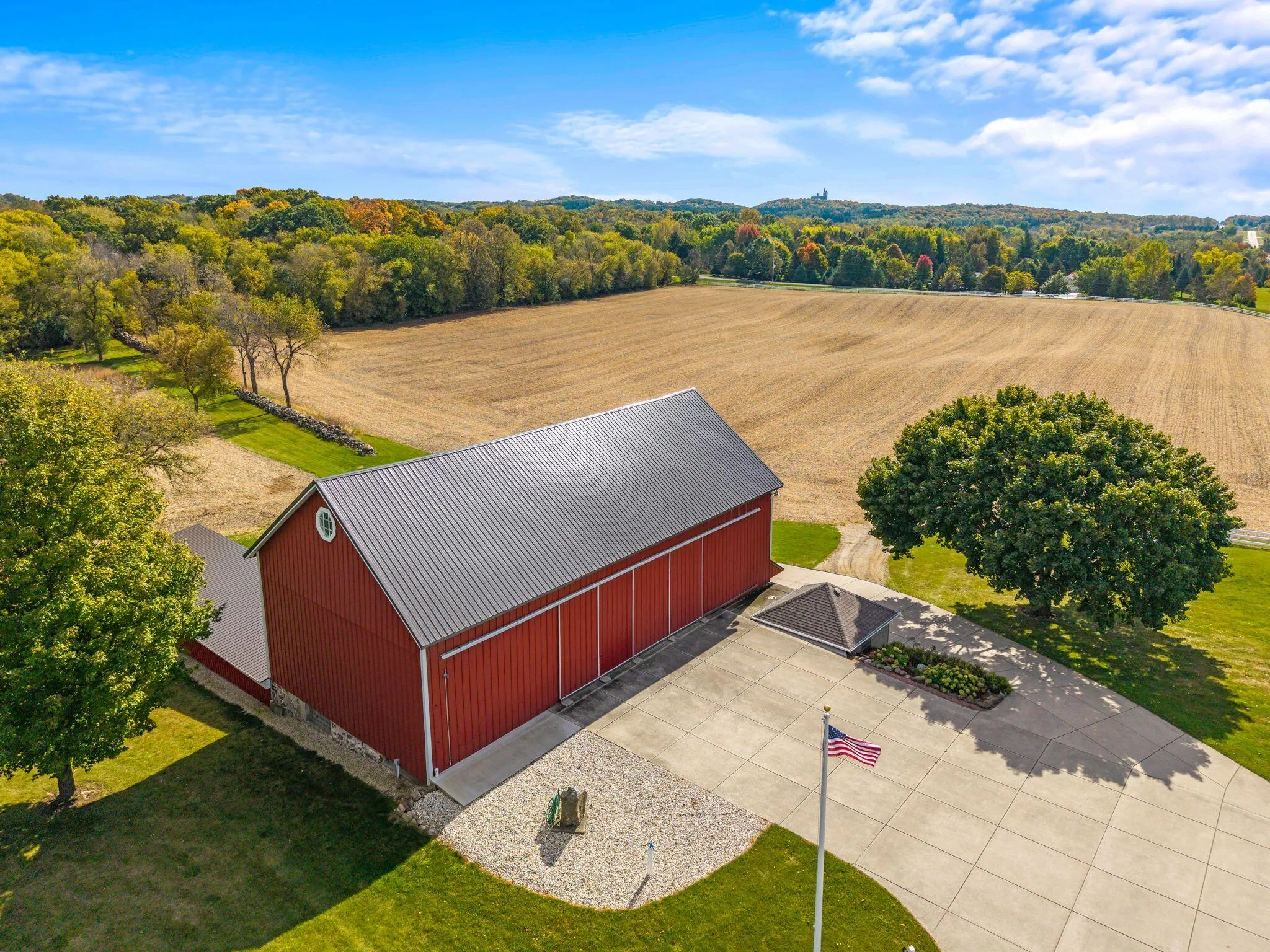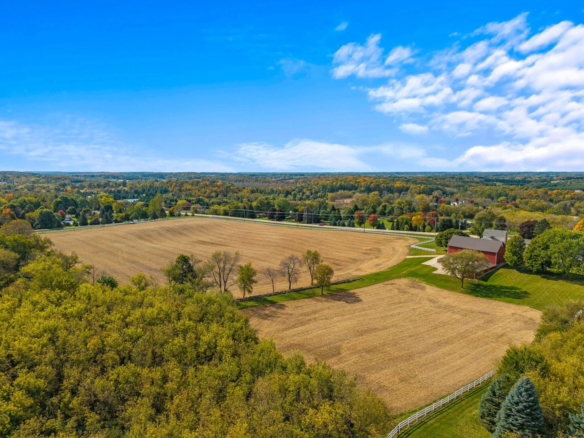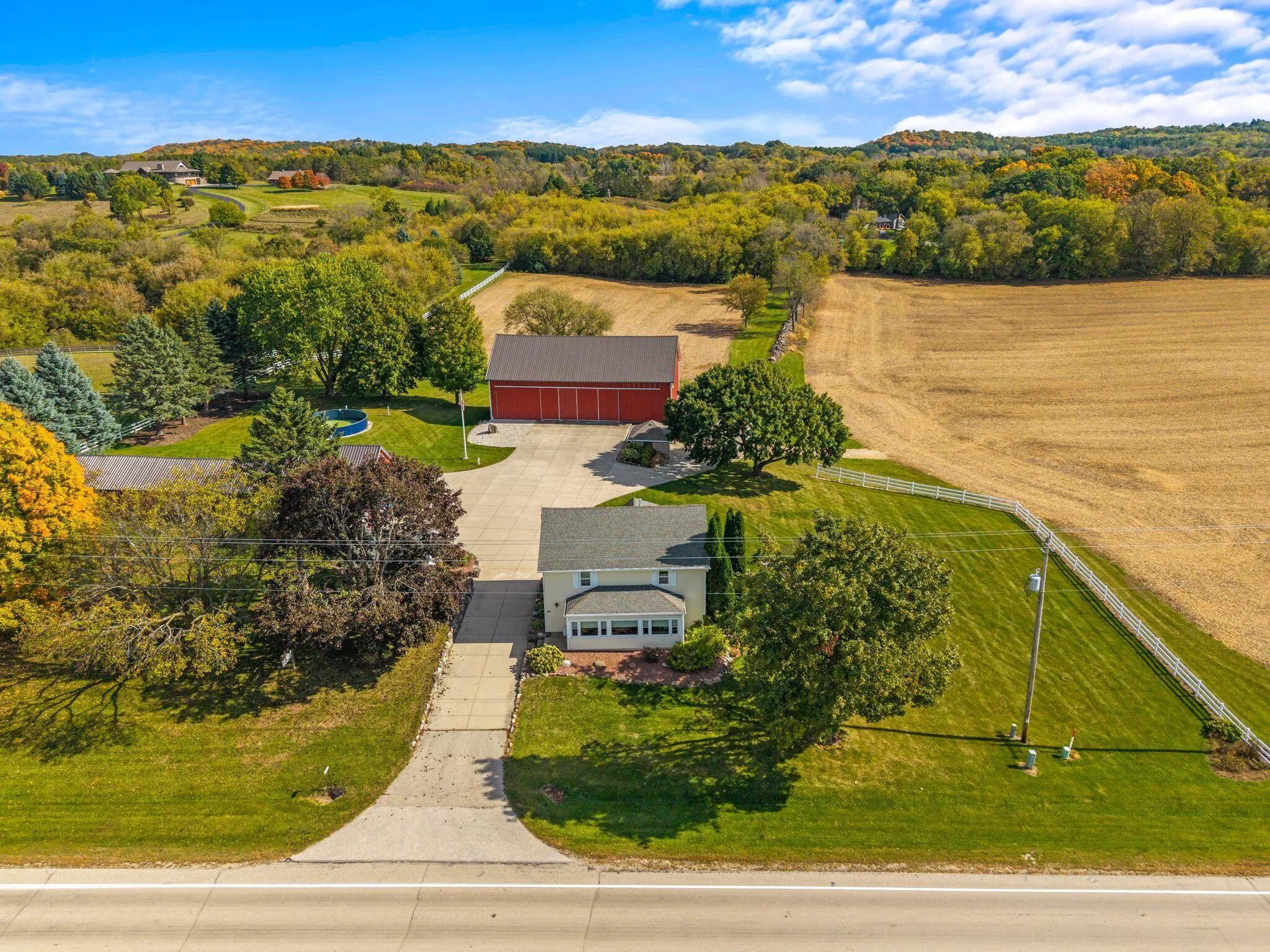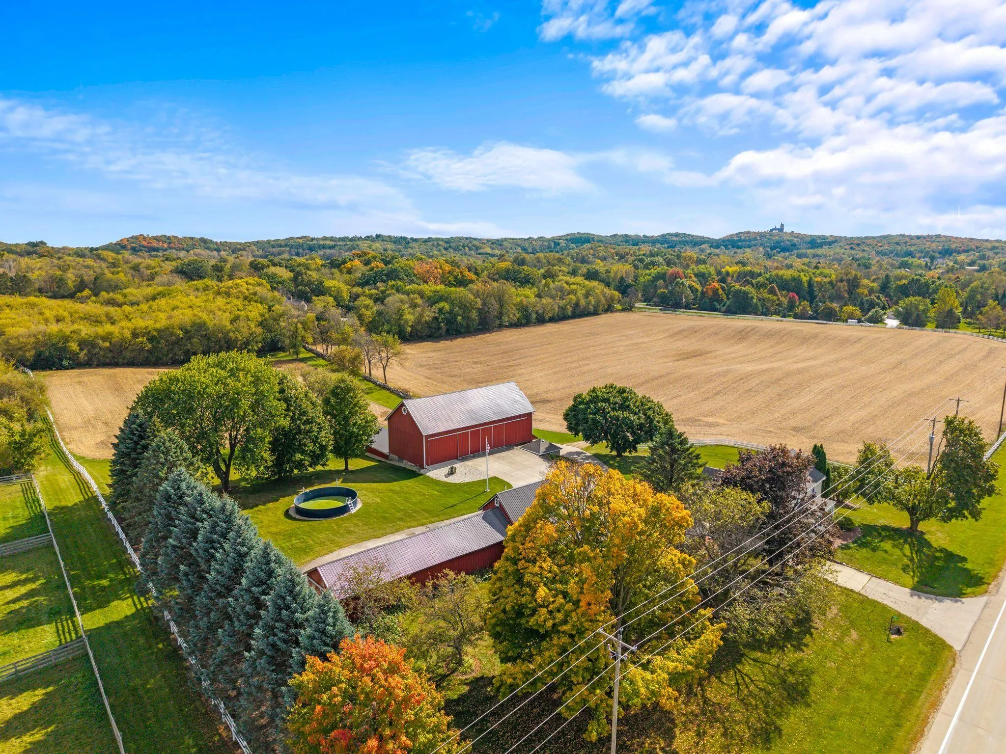 Charming and immaculate 15-acre property with rolling hills and views of Holy Hill! This property is in exceptional condition and includes a 4 bed, 2 full bath spacious farmhouse which has been nicely renovated over the years, and the kitchen was updated within the last year. There are multiple garages/outbuildings, including a barn, which has been updated with newer metal siding and roof, and concrete flooring and sliding doors on the first floor. So much garage/storage space for all your vehicles, toys and collectibles! Even a unique pool made from a blue silo… So cute! The possibilities are endless – could be perfect for a hobby farm, extra space for your workshop/business, or peaceful country living with abundant wildlife watching! Perhaps even split off and build another home!