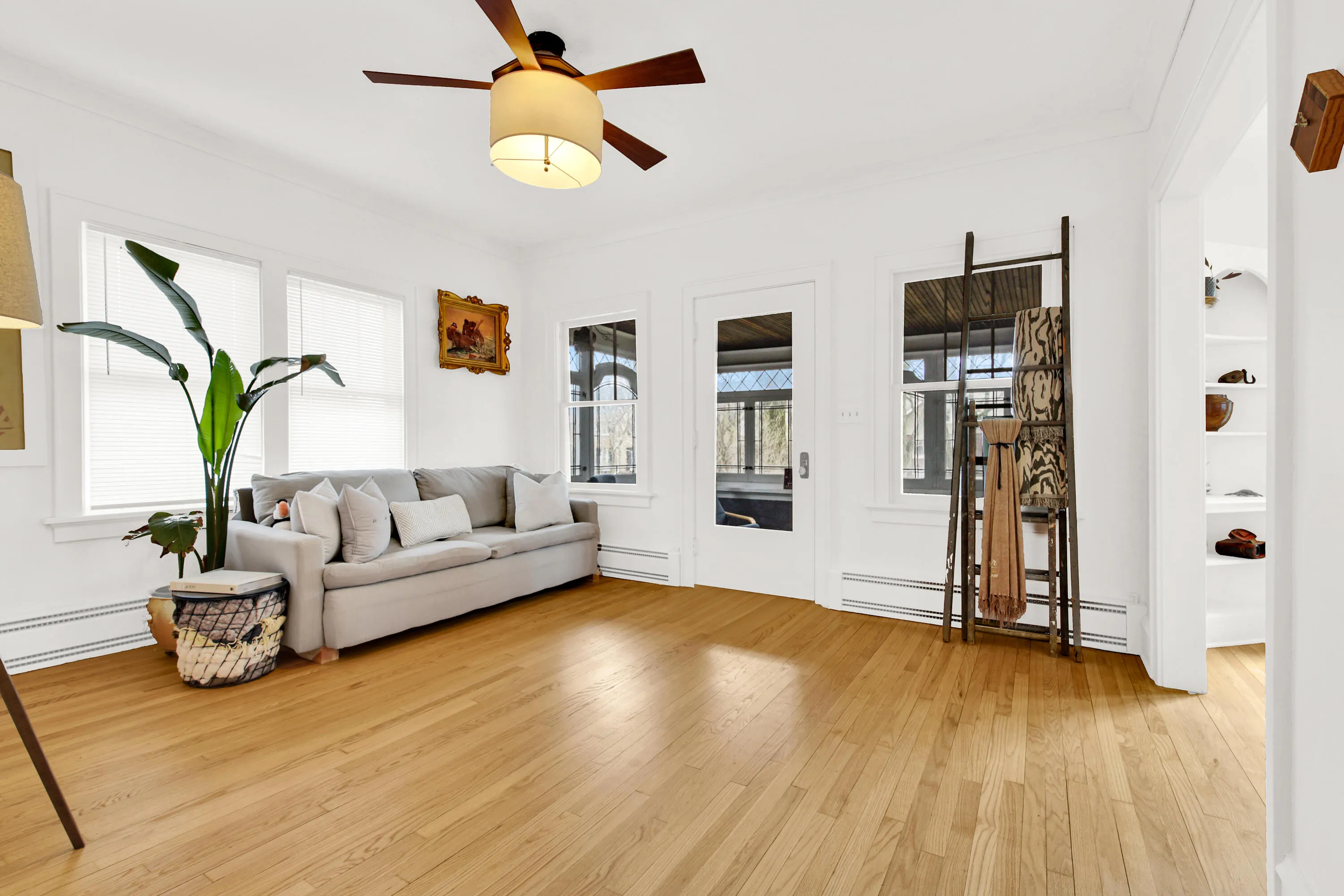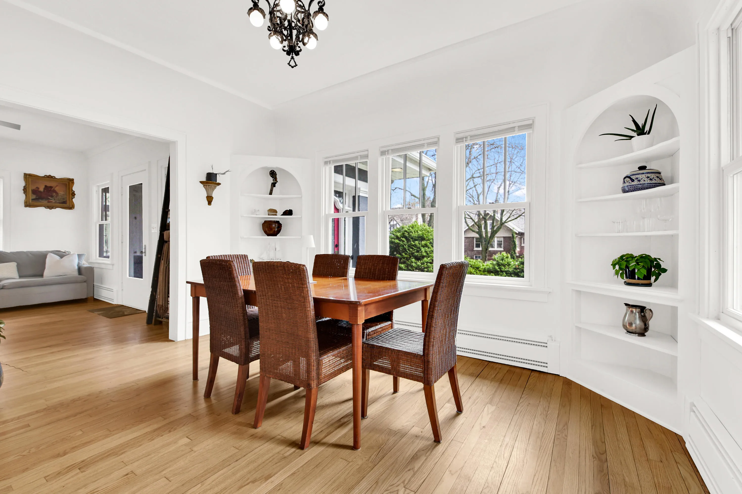Sunny side up! Start your day enjoying a cup of coffee in your spacious, enclosed sun room with slate floor and three walls of leaded glass cottage style windows for viewing pleasure and fresh air! Saunter inside and smile as you notice the beautiful red oak hardwood floors and dramatic design of the open staircases in the living room; coved ceiling, built-in china cabinets and nook in the dining room; pass through the arched entry to a kitchen you will linger in to adore the blend of classic arched glass door upper cabinets and contemporary lower cabinets featuring ample deep drawers, spacious countertops and tastefully accented tile backsplash! Upper suite has patio doors to a balcony, adjacent wet bar, party-sized shower & huge walk-through closet; bonus room has 2 skylights. WOW!!
