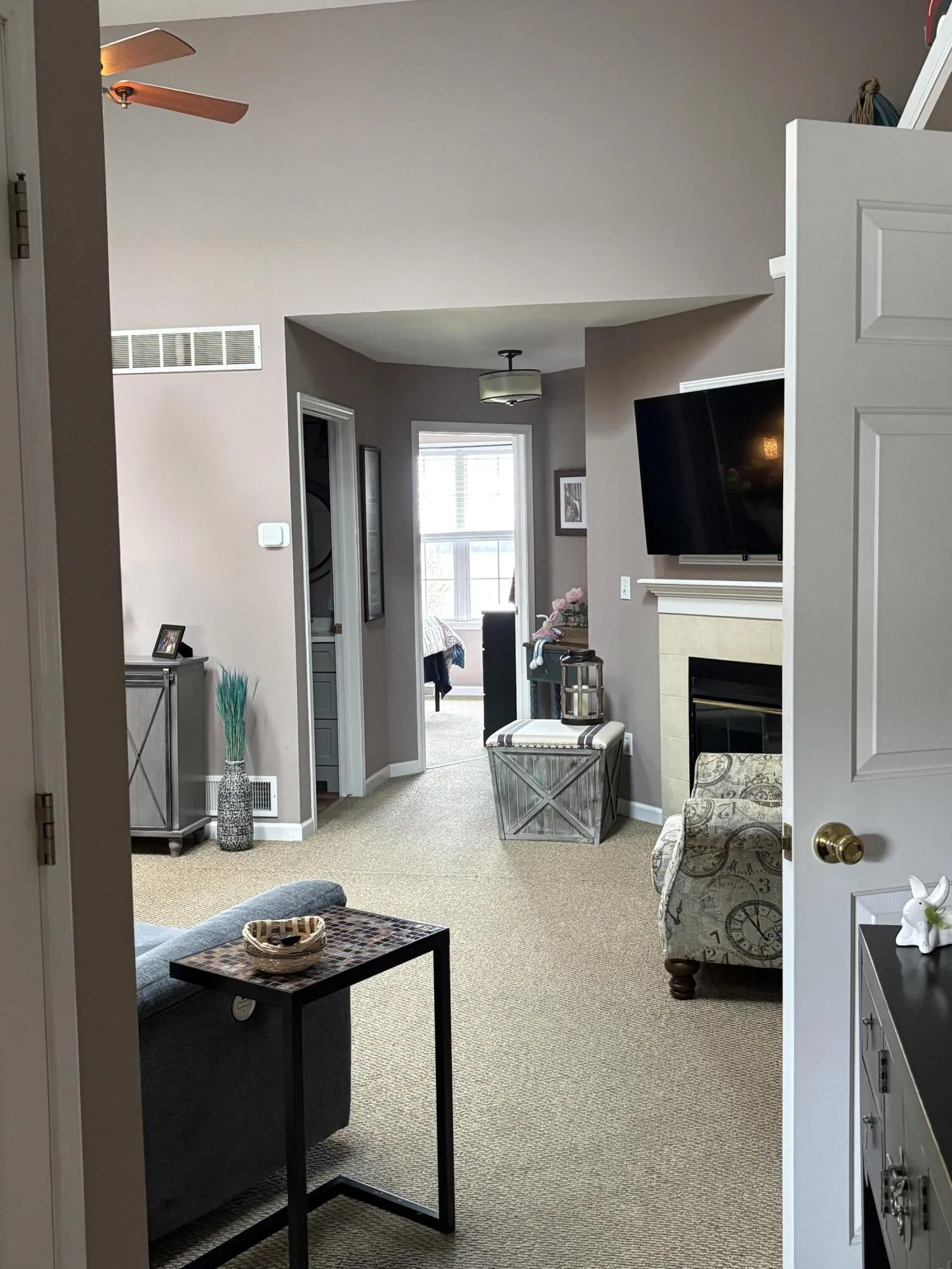 Well-maintained 2BR/2BA ranch condo in a quiet 8-unit association at the end of a cul-de-sac. This 1,105 sq ft unit features an open-concept layout with cathedral ceilings, a spacious living area with fireplace, and abundant natural light. Kitchen and dining areas flow seamlessly for everyday living and entertaining. Primary bedroom includes access to a patio with peaceful, open field views with light, infrequent rail activity. As this is the end of the line, trains typically arrive once per week for a brief stop (about an hour or less) at a nearby lumber yard. Activity is minimal, with little to no horn use. Additional highlights include a full basement offering ample storage or future finishing potential and an attached 1-car garage. Condo fee of $195/month.